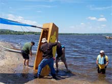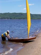 Grant steadies the boat while Bill Paxton prepares to launch his Stevenson's Weekender SURPRISE from a lee shore |
