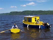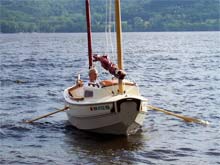 Stephen Collins rowing a Peanut Pram built by his daughter out to his Micro Trawler. |