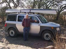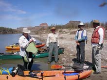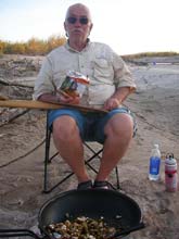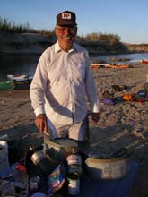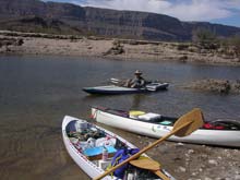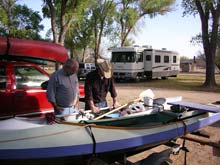 The first night we spent at the Castolon campground. Unfortunately, floods earlier in the year had wiped out half the campsites. So our group had to double up. Skip's unusual boat draws a lot of attention - here a total stranger walked up and examined it closely. Of course Skip was not shy about showing it off. |