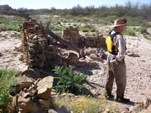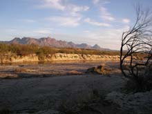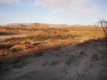 After dinner I hiked around a bit. I was amazed at the extent of the recent flooding. This picture shows what was once a patch of cane which normally grows high along the river but which has been scrubbed almost clean. If you click the picture to enlarge it, you can see the river way below. The interesting thing is that most of the flood water came out of Mexico, entering the Rio Grande just above Big Bend via the Rio Concho at Presidio. |
