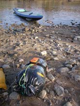 Packing up the next morning. Paddlers know about dry bags - heavy plastic duffle bags that keep the water out of your gear. This one is clear which makes it much easier to see what is inside. On top of it is my new Spot satellite locator. I send several "I'm Ok" messages each day for the benefit of those who could not come but wanted to check on our progress. Click HERE for a Google Earth file that shows our route. |