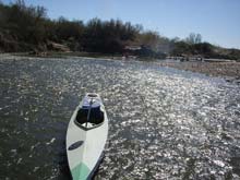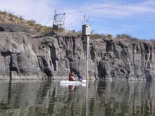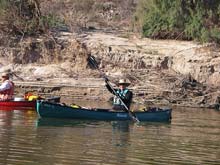 There are numerous riffles like this one along the river since it is pretty low. All the plastic boats were able to go bouncing over the rocks without worry - even Skip's boat seemed immune to damage. But I had a cheap plywood boat and I often walked the first day or two. Here the current takes the boat out in front as I hold the painter. You can see the other boats downriver. Later I learned to just back-paddle to go slow enough to avoid holing my boat. |