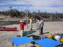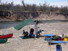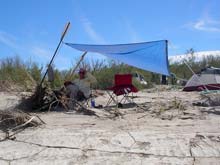 It has been another hot day so when we stop around mid afternoon, Skip and I rig a sun shelter from a tarp and a couple of paddles. We thougth we were pretty clever... |
