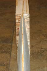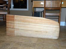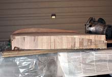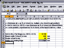 Newton would have used calculus to “derive” the slope of the foil at any given point – I used a simple spreadsheet with the calculated NACA 0013 values (Pathfinder plans call for a 60mm "thick" foil over a "chord" width of 425mm...so 60 divided by 425 is 14...I rounded down a bit to 13 to allow for some fiberglass layers).