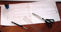 So, while the exercise in “math” was interesting, the really useful part is that you can simply print out the “chart”, then cut out the foil and jig shapes as real size patterns– no need to loft or bend a batten around a series of points. Using Microsoft Excel, I simply printed out the graph – measured its actual size on the printed page, and re-adjusted the height and width of the chart a couple times until the printed size matched the plan measurements. I had to tape together a couple pages, and I added some tape to the lines before I cut them out so that the paper would be a bit thicker for tracing around. Then I cut out the template and profile which I traced on to the plywood.