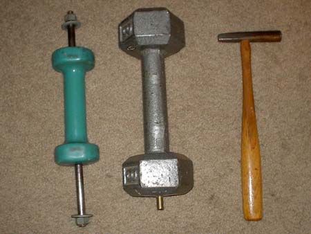 This tool is made from an eight pound bar bell. The only modification made was to add a brass rod. This allowed me to buck countersunk nails.