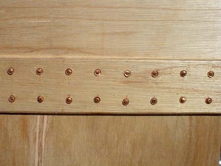 Only God has more clamps than Norm Abrams. Clamps are a pain. They never are just right. They mark the wood. They slip while you hammer and there’s never enough of them. So use washer head screws set into predrilled holes to join and clamp the laps and always predrill. And always do a neat even spacing on the holes. No matter how you fill and sand, it will show. After you have screwed on both the right and left laps (you must evenly load the boat or it will be distorted), then remove one screw at a time and set a rivet.