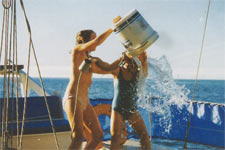 Tarsh and I having a water fight at the back of our yacht. |