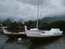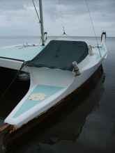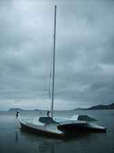 We built her from two asymmetrical fiberglass Piver trimaran amas