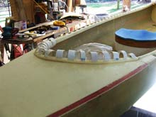 Cut and glued ledger strips for decks. Carefully pulled braided fiberglass sleeve over various parts and epoxied. Clamped gunnel strips along sheer so they would take proper curve. Routed slot in bottom of minicell seat platform with dovetail bit. Router is my least favorite tool, by a large margin, but it cut a beautiful clean slot in the seat base. Also drilled holes in seat front for 35mm film canisters (aspirin, electrolytes and antacids). Fitted decks and glued in place. Drilled out bow and stern eyes, shaped up foam and coated with quickfair.