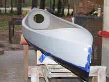 Start on inside. Marked approximate 4” waterline while boat was upside down and level. Also marked major bubbles to be repaired. Cut cradles to support hull right side up. Popped rubber bands loose from inside hull and lifted boat off form. Boat came off form easily. First trip to the scales showed the weighing just less than 17#, not too bad, close to theory. Trimmed the gunnels, sanding a 45 degree bevel on outside edge. Pulled rubber bands and shaped the inside, using sureform to take off the glue beads. Shaping was mostly with DA sander on bottom and sides and a piece of 2” pvc pipe wrapped with 60 grit on the bilges. Added a little klegecell to ends to get solid backing for bow and stern eyes and to simplify putting fabric in ends. Filled major cracks and blowholes with epoxy micro/microballon mix.