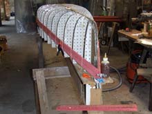 Real work. Stripped old packing tape off forms. Re-glued keelson. Ripped strips, four sheets of 32” X 48” should be just about right. Ripped strips 1 ¼” wide. Thought about ripping some narrower for the turn of the bilge but decided the strips were thick enough that fairing would not be a problem. Machined bead in strips. Bead and cove are ¾” diameter so that there is just a curved edge about an 1/8” high on edge of strips rather than a full half circle. Makes strips easier to fit and there’s less waste. Took eight strips and glued them up into two 16’ starter strips for gunnel. Balance of strips will be fitted on form in 4’ sections. Machined the cove in the remaining strips.
