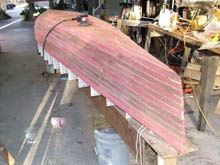 Cold today but I need to forge on. Put new packing tape on form. Added nails in edge of forms at sheer, holes were predrilled. Put a strip of ¼” thick strips of mahogany along sheer to reduce depth of boat just a bit and to spread out the load between nails and form. First sheer strip goes on in one continuous piece to help keep everything fair; rest of boat is stripped with four foot pieces. Got shear strip and one extra layer on boat. That’s all; I’m not much good below 50 degrees.