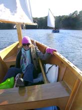 Olivier gets a picture of Tiffany bundled up on a cool November day (about three weeks after their wedding on a warm October day!) on the Goat Island Skiff. That's Helen and me in the background on our Michalak designed Frolic2, Oaracle.