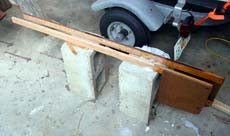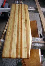 The mast had been built along with the hull, but not the tiller, boom or yard. The yard we cut down from an old boom I had on hand, while the boom was laminated from spruce. The latter required three separate steps, or work sessions. The first was to laminate the wood. The second was tapering it according to Storer's precise instructions, round the edges, wrap fiberglass tape around the ends to prevent splitting, and coat the spar with epoxy. Finally, after the epoxy set, holes have to be drilled in the ends to take the lines that tie the corners of the sail to the spars, or in our case, install the eyestraps that serve the same purpose.