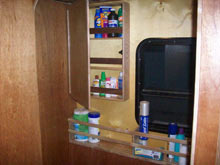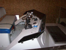 Lower helm seat with shelves for underwater camera, Xbox, boat manual, and propane shut off valve |