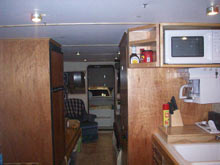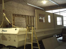 We stripped it down to bare glass, ground and glassed new stringers, floor supports and transom to handle the new outboards, previously had I/O. Power was decided to be two Yamaha high thrust T-60 four strokes. The boat was originally rated for 250 hp but it’s a houseboat not a ski boat. For the floor we used ½”marine ply., then 1” holes were drilled every foot and filled with USCG app. foam from hull to floor then encapsulated in glass.