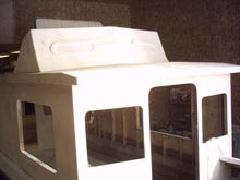The walls, cabin top and fly bridge were made with ¾” ply. for studs and joists then ¼ Baltic birch ply. was glued and screwed and 6 oz. cloth was applied to the exterior with West System epoxy. All wood was sealed with epoxy.