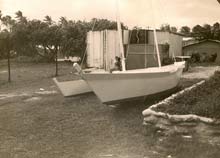 Kejak is the Marshallese word for funny. Actually the building of Kejak, a 21 foot dory sail boat was a funny thing. We had built our house out of cement and had used a lot of wood for the cement forms. Even the ceiling was cement, and we had used wood braces underneath. We used some in the interior of the house, sold a few pieces to other people, but most of the wood was sitting on the roof of our house quietly rotting.