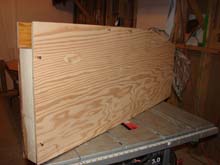 Without wasting any time I dragged in some plywood, measured and cut the floor/bottom panels. I scarfed the two pieces together and clamped it down with handy items including a bucket of left over lead weights. The panel was placed against the wall because it was going to be used very soon. |