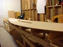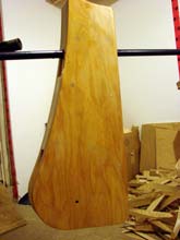 This sucker is big! I’m standing at the wall and it runs the full length, but it fits, barely. The lifts that make the curve of the Pathfinders bottom were carefully measured and screwed in place. The floor panel was then screwed down to this jig. (Note to self: remove hold down screws from jig before finishing floor panel) |