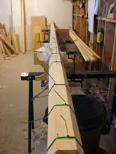 Once dry fitted and checked the assembly was marked and glued. Cheap rope and cable ties were used to clamp the assembly evenly and placed in a jig to make sure it set straight. Each part was done in this manner. I don’t know how many times I checked the length of the mast before gluing. A fear of building a perfectly straight mast that was too short hung over my head. These 3 items once dry were put aside for finishing some other time. I didn’t want to push my luck after a successful glue session. |