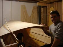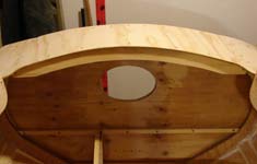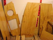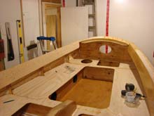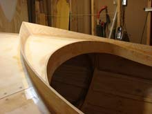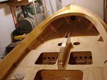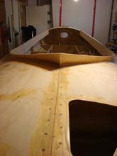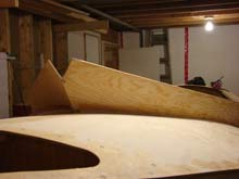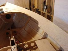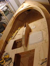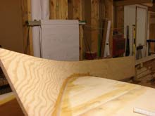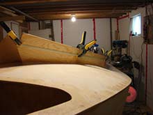 I cut an over sized piece for the side decks and matched the forward edge to the main deck plywood. I have seen many pictures of pathfinders and most have a deck that went straight across from port to starboard. I wanted to do something different and make it curve and eventually meet the seat backs and coaming. My side deck plywood was left oversize on the inside a fare bit to allow for my adjustments to the curve. |