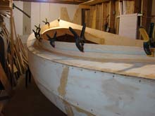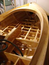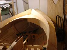 I made the rear seat backs by just cutting and fitting a suitable sized piece to the back. It was scarfed along with the forward piece to make a nice joint. The forward curved pieces were short and easy to handle so it took only an evening to test, cut, and test again. The pieces were glued in place and scarfed to the seat back at the side. |
