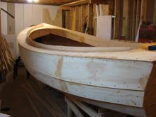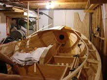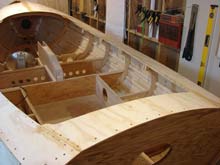 I remembered to remove the jig screws that held the boat to the jig. I wondered if I would forget that small item. All the floor beams and cross members were glued in place and I added some members to handle my abuse of jumping inside the boat. Hey, it could happen. |