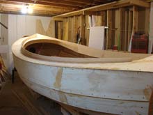 I proceeded to clean sand, and apply epoxy fillets to the joints inside. It sounds like a simple thing, but it took me many evenings of mixing and applying to finish. It was like caulking 4 or 5 bathtubs each evening. Once cured, I gave the inside 2 coats of epoxy to seal it all. |