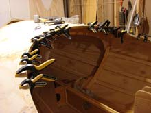 This method was continued to the back of the boat. I left it overhanging to be trimmed later. With all these pieces fitting and looking right, I removed them all and prepped them for epoxy coating. Each piece got 2 coats on the underside. They were then glued and screwed in place.