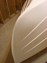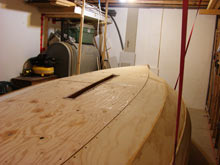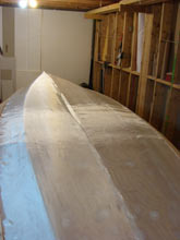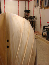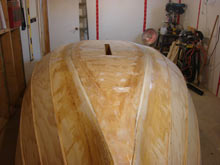 I trimmed it to size and mixed up a bunch of epoxy for an evening of sticky work. The runs near the stem had to be kept in check but it wasn’t too bad. More epoxy was rolled on later and a layer of biaxial tape was run up the stem for reinforcement. |