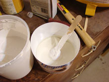 I chose Interlux “primecote” for the base coat since it had to be the link for the paint to follow. It’s a two part primer but when I opened the gallon can it looked rather thick... perhaps it’s the hardener that does the thinning and eventual hardening. I scooped out the prescribed amount and waited for it to settle in the cup. That sentence should be enough warning, but no, I had to add the hardener. I mixed as best I could but to no avail.