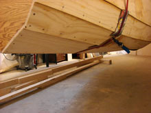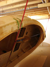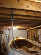 A bridle between the front and back straps would keep them from slipping over the ends (it is a curve after all) I placed cardboard at the plank edges to protect them. With some tension and load placed on them I proceeded to take the jig apart. First, removing the last remaining screws that held the boat to the jig, and then disassembling the lifts under the hull. When the last lift was removed, the boat was basically left hovering there in the shop. |