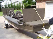 We carry two folding chairs, a come along, and bow saw under the front deck. We store ponchos, first aid kit, extra rope, etc. under the rear deck. The storage area under the lids is also used to store individual coffee and soup thermoses, lunch bags, personal items, etc.