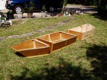 The bow and stern sections meet the mid section with matching dimensions. The stern section is 42” in length. The bow transom and the rear transom are sandwiches of Luan and furring strips. First the pattern for each section was laid out on Luan. The furring strips outlined the pattern using Titebond. This was cut out as it dried and a top section of Luan was set in Titebond.