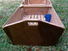 The front transom is 18” high and 12” across at bottom and top. The rear transom is 18” high with a handle set in at the top. It is 24” at the bottom and 28” at the gunnel angling up to the handle. I made a wooden handle for the bow and screwed it on the front transom.