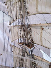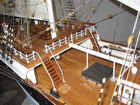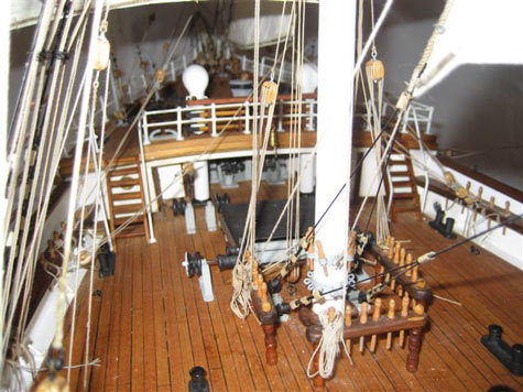 The model’s hull is planked with 480 feet (146m) of 3/16” kauri pine and decked 369 feet (121m) of kauri planking laid on a 1/16” waterfroof ply deck. The patience, skill, a steady hand and good eyesight needed in the construction by Ian I believe needs stressing. On the patience side there is the time taken before the model would be completed, the steady hand requirement does not need explaining but can be linked to the highly intricate work such as the 234 belaying pins, each one lathe-turned from standard pop rivets and filed to shape, and the attaching of the ship’s ratlines to the shrouds requiring 1,510 clove hitches that needed two pairs of tweezers plus a magnifier!