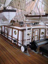 Stern detail including the taffrail around the poop, steering wheel and stern carvings. Note `in and out' strakes of hull plating. |