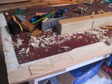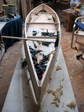 Levelling the chines with a Stanley 78 and a bevel stick. |