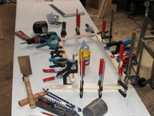 I then ripped several boards into strips about an inch wide, using the bevel and the lofted shape on the strong back, and avoiding any big knots, laminated up the frames in place forming sort of ready-made half-lap joints at the corners. Easy as pie. It was warm and the glue I was using, the local version of Tightbond III, was firming up nicely in about 30 minutes so I was able to work quickly.