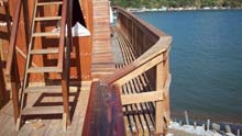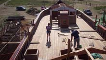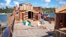The walkways aft have spaces between the planks to allow water easy access and egress. |