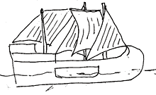 The foresail is triangular, set pretty much as I drew it. The main mast has a square sail and a staysail abaft, and there is something like the fisherman staysail that you see on Grand Banks Schooners between the main and mizzen. I didn´t go into the whys of this sailplan. I expect it has something to do with keeping the vintage look.