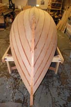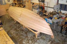 Attached are pictures of the prototype with the Sheer strake finally glued up on Thursday evening, letting us see her shape - I will not use any adjectives here, and let the pictures speak for themselves.