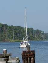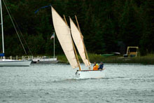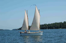 The photo taken with two people in the boat was taken when the wind was blowing 20, the water doesn't look like it but we are in a narrow channel and the wind has no fetch. We didn't take a reef (which we would have done normally but I didn't want a reef for the photos).