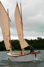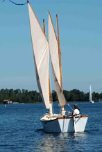 Chuck, I wanted to send you some photos we shot of Pandion. We had a chance to use a GPS to see how she pointed and I was pleased that in light wind she'll point through 100 t0 110 degrees - as the wind picks up she points though a solid 100 degrees. For a beach cruiser that draws only 28 inches with her boards down that's very nice. I've had no trouble beating up the channels here.