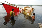 The second time I had Hunter, all 80 pounds of him, right the boat. It came up very easily for him. Not a drop of water in the bulkheads as the hatches were out of the water at all times. It took on quite a bit of water but I was able to get back in over the side without it capsizing again.