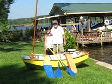 Here are a few photos of my Nymph with the Tender Behind sail as you requested. I’m still experimenting with the rigging, since this is my first lug rigged sail. The mast as shown is a little too short, so I’ve started making another one. However, the first sail in light winds was very nice. The rig is well balanced and has a slight weather helm. The third picture is one of my two grandsons who “helped” with the construction.