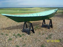 I'm happy to report that Jiggity, our Auray punt built from 3/8ths marine ply, turned out to be bouyant and dry, light to tow and a very acceptable rower. She yaws about somewhat as all dinghies will when towed, but with her wide Auray punt bows there's none of the digging-in that you get with a sharp-bowed dinghy. On a run in 2-3ft waves, it yaws and scoots down the fronts of waves sure enough, but the following snatch when her line pulls her straight when she stops is lighter than even I expected. She showed no signs of wanting to climb into the cockpit with us in any conditions, which was also a boon.