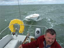 A word of warning on towing. I'm still new to yachting rather than small boat sailing, and from time to time I learn something the hard way. A tiny rough area on the stainless steel ring on the punt's bows we were using to tow Jiggity cut through the line and for a while we lost her among the white horses, and had to return half a mile or so to do so. We did find it, but I've made mental notes never to paint a dinghy white again (as a temporary solution, I think I'll stick some coloured tape under Jiggity's gunwales), to use two towing lines at all times, and to put a smooth bodied shackle on the rough stainless steel ring.